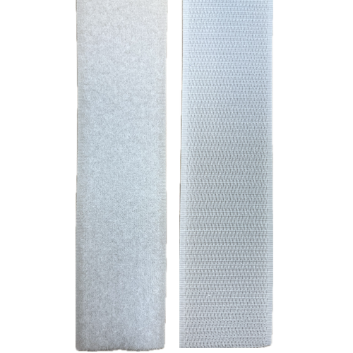 White hook and loop fastening tape in 25-meter rolls, sold separately by type. Ideal for sewing, upholstery, crafting, organization, and industrial use, it provides strong grip, easy release, and long-lasting performance. Available in multiple widths for professional and home applications.